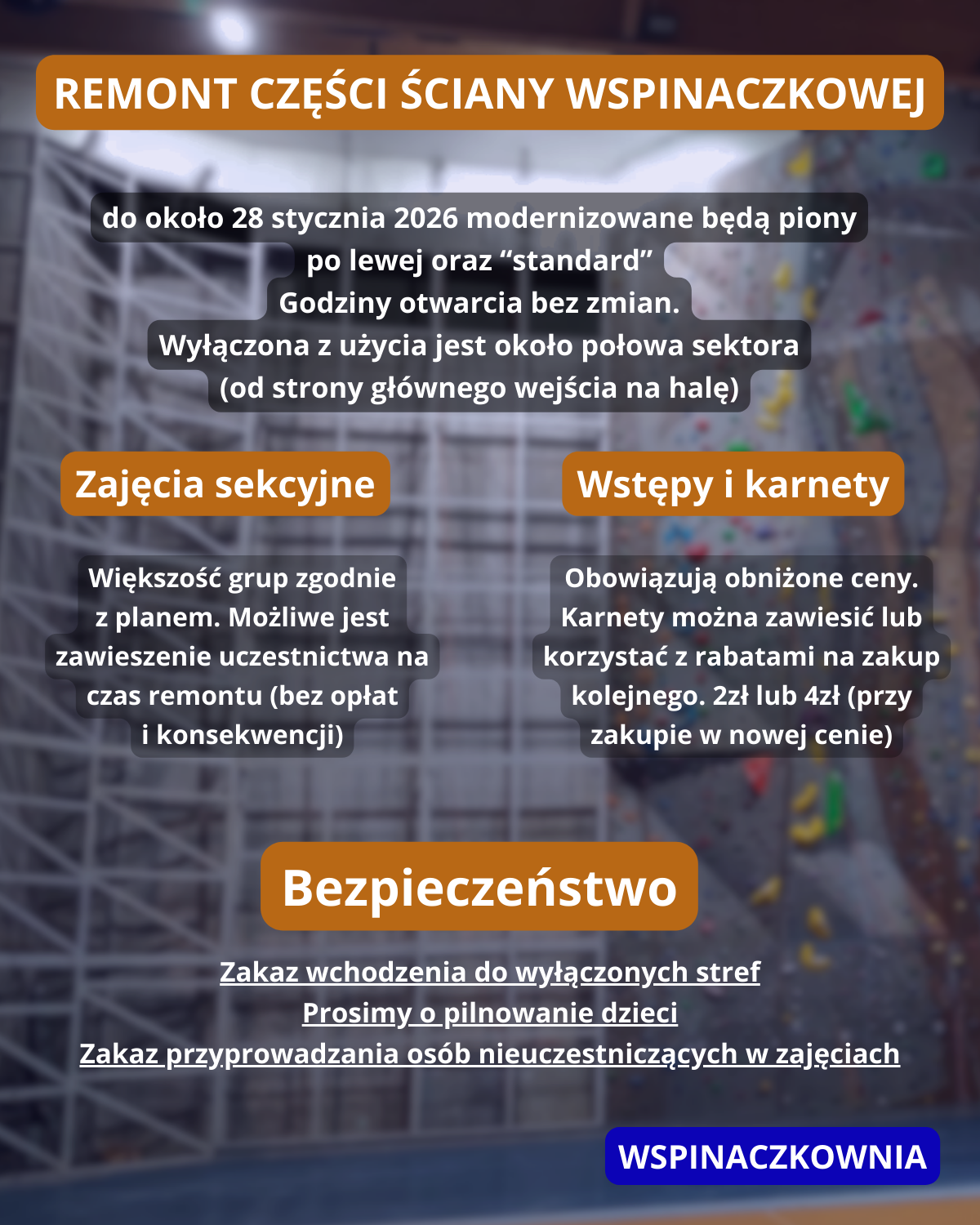 Poza wstępami, prowadzimy także zorganizowane zajęcia dla dzieci i młodzieży z trenerem. Trener prowadzi rozgrzewkę wplatając ćwiczenia w formie zabawy. W trakcie zajęć pomaga asekurować.